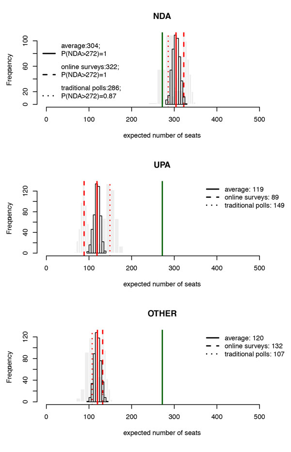 Second, we organize the Indian nation into a stratification frame that has 6611 cells – essentially these are defined by the number of demographic categories in our forecasting model that includes income, religion, caste, gender age and education. We generate estimated vote probabilities for all of these cells (or, if you wish, demographic categories) feeding survey data collected from our different online subject pools to a random forest. A novelty here is estimating the vote probabilities separately for the CESS Online and MTurk subjects and then combining the estimates. Figure 3 presents the expected vote share by alliance for the online sample.