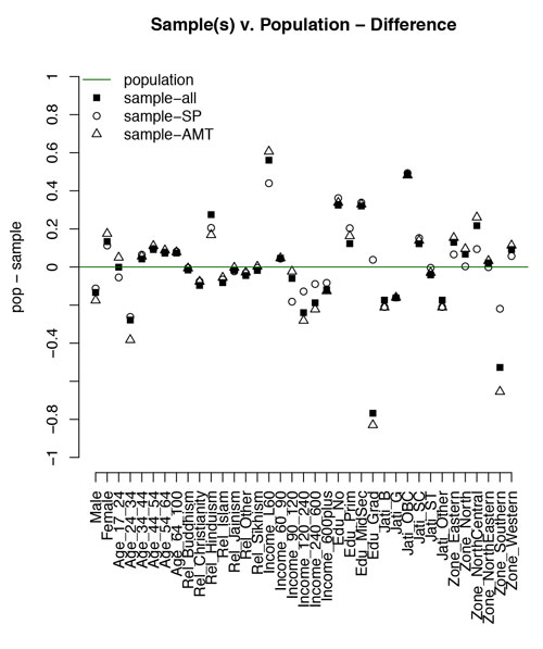The novelty of the CESS India Vote forecasting project is three-fold. First, we incorporate multiple and quite diverse online convenience samples as part of the estimation strategy – we complement information from the CESS India subjects with very regular surveys of MTurk workers in India. Different convenience samples will add complementary information to forecasts of this nature – the broader issue is how to identify the convenience samples that provide optimal complementarity to forecasts of this nature. We propose estimation strategies that integrate quite disparate subject pools. Figure 2 summarizes the differences between our population data and the data obtained from our CESS and MTurk samples.
