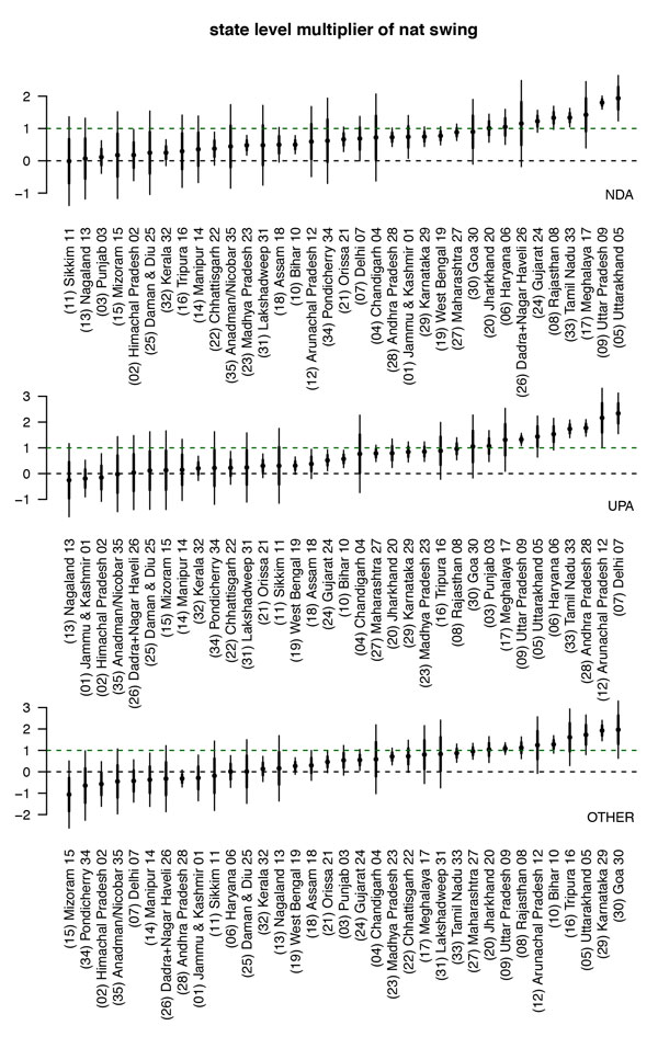 Thirdly, we forecast the national vote share for the major parties by simply applying the cell probabilities of voting for each party to population estimates for those cells obtained from the Indian Human Development Survey. This allows us to estimate a national swing for each of the major parties. The novelty here is that we use historical data on the relationship between national and state swings in vote shares to estimate the seat shares for the state parties. The state level multipliers of the national swing are presented in Figure 4.