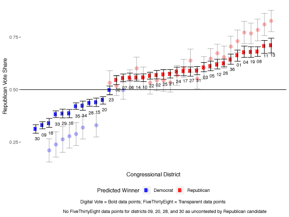 Figure 2 compares the estimates of Republican 2-party vote share based on the Digital Vote project against the FiveThirtyEight forecast, for the week before election day. Our Digital Vote forecasts, particularly for the least competitive races, tend to gravitate closer to 0.5 than is the case for FiveThirtyEight. This reflects a noisier signal from the social media sample. Note the uncertainty intervals around our predictions are narrower compared to FiveThirtyEight reflecting the very different estimation methods employed here.